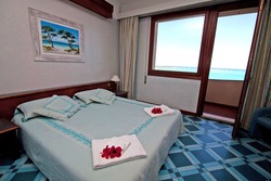 Camera family garden (su richiesta): doppio ambiente con un bagno da 4 posti letto (letti piani), disponibili senza supplemento fino ad esaurimento disponibilità; supplemento camera vista mare (su richiesta): € 20 al giorno a camera in tutti i periodi;